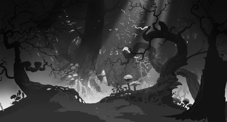 Dark woods where the forest floor contorts like a stormy seascape-even the horizon is not a straight line as if there is no level ground to keep you safe.