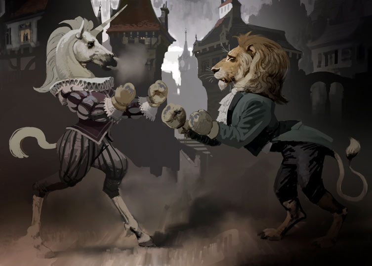 The lion and the unicorn having a punch up. Didn't get to finish this one...bit of a muddled composition; probably beyond rescuing.