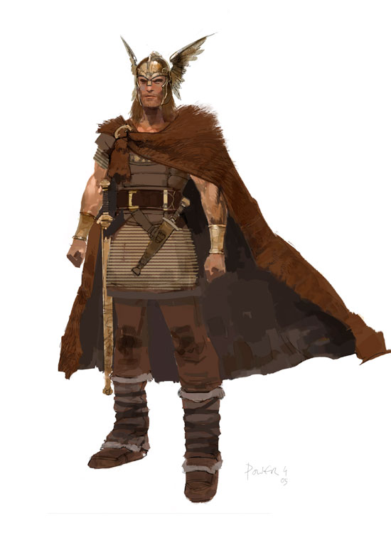 Tall and Thor- like Beowulf. Winged helmet is silly but I like it. prefer this colouring as well. Ended up black and white in final film.