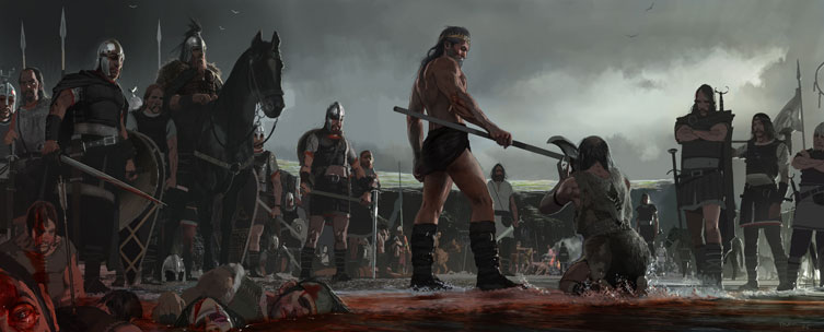 A lot of effort for a keyframe that didn't end up in the film....at least not with as many characters. Beowulf looks daft in his speedos ...some of the background guys look ok.