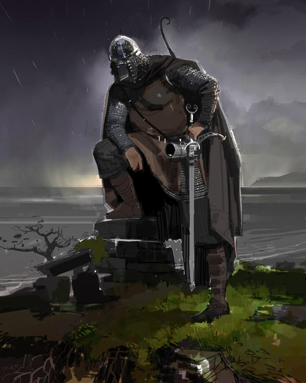 Watchman on cliff above beach on which Beowulf lands. Very sketchy but still has lots of elements that turn up all the time in my work. Straight line's set against curves, Silhouette's of light against dark and reverse...and greens going into browns. and yellow lligth on the horizon like the landscape I grew up with in Ireland (and rain) |