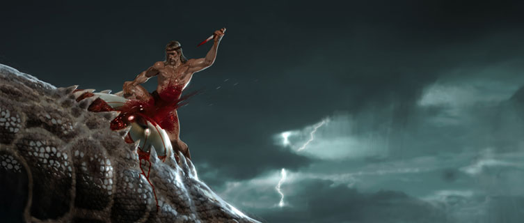 Keyframe based on CG pre-vis render of Beowulf attacking one eyed sea creature. Poor creature hadn't a chance with monocular vision.