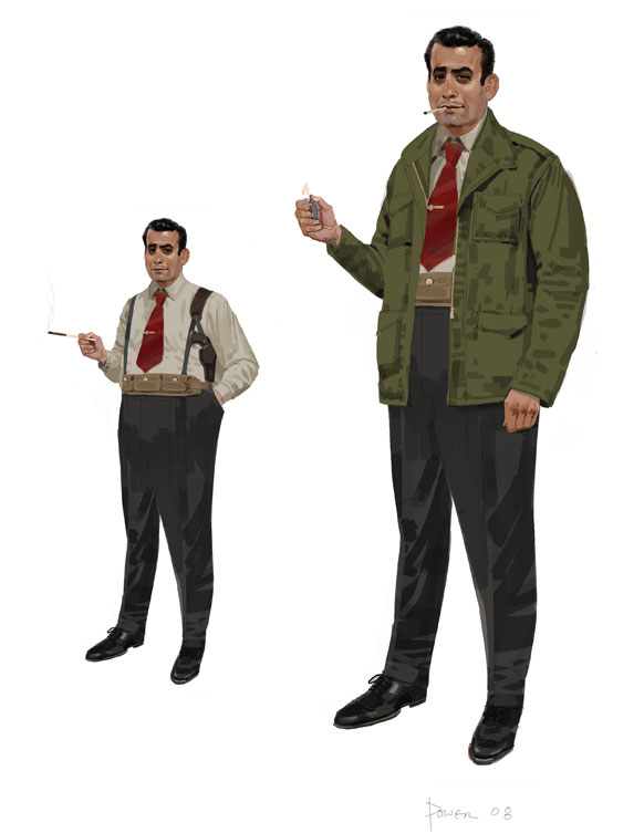 Decided to make him more Mediterranean and swarthy instead of just overweight. And how to make him look vein but tough? Army jacket with tie pin seems to work.