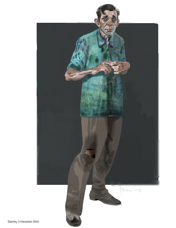 Stanley. In film you have to be careful not to tell an actor how to act- In games they want the whole backstory in the image. Shirt, hair and shoes say he's a lounge musician but he's sold his trinkets and trumpets so he's an addict.