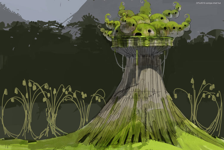 Design for Oompa Loompa Chief's 'palace'. Basically a collection of mud-wasp like huts creating spirals from decreasing chambers.