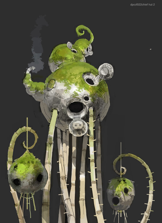 More modest chief's hut . I liked the idea of the dank rainforest causing them to be covered in moss. The hatches are like something you would see on a tank.