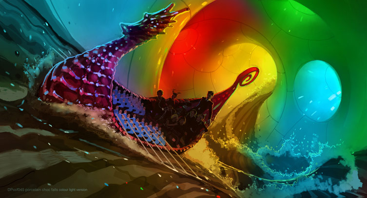 Candy boat with pipework coloured like psychedelic art installation- Wonka standing at back like carnival ride operator not bothered by vomit-trip.