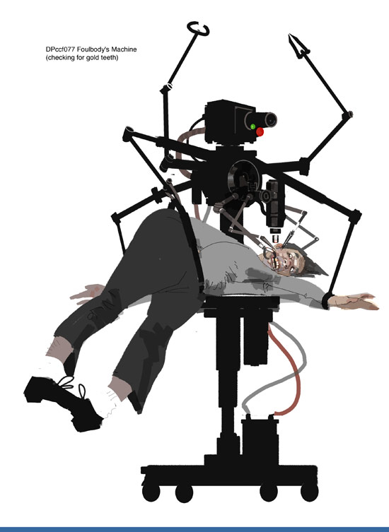 Gold finding machine goes crazy. The idea was that there is a 'mother and child' ...the larger machine grabs the victim and the smaller one does the close work.
