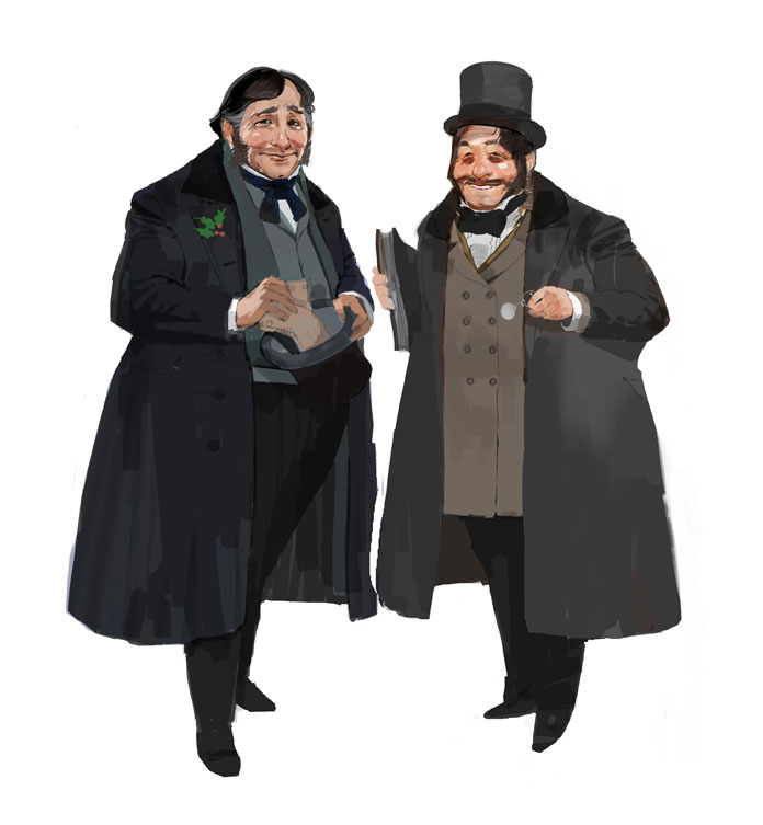 Two fat Gentlemen looking for donations. One smarmy the other abashed. Almost all the costume drawings are done with blocky shapes coloured with lighten layers and line work at the end.