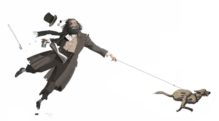 Scrooge scares the blind man's guide dog into dragging his master down the street. They didn't have guide dogs until after WW1 but don't let accuracy get in the way of a good joke.