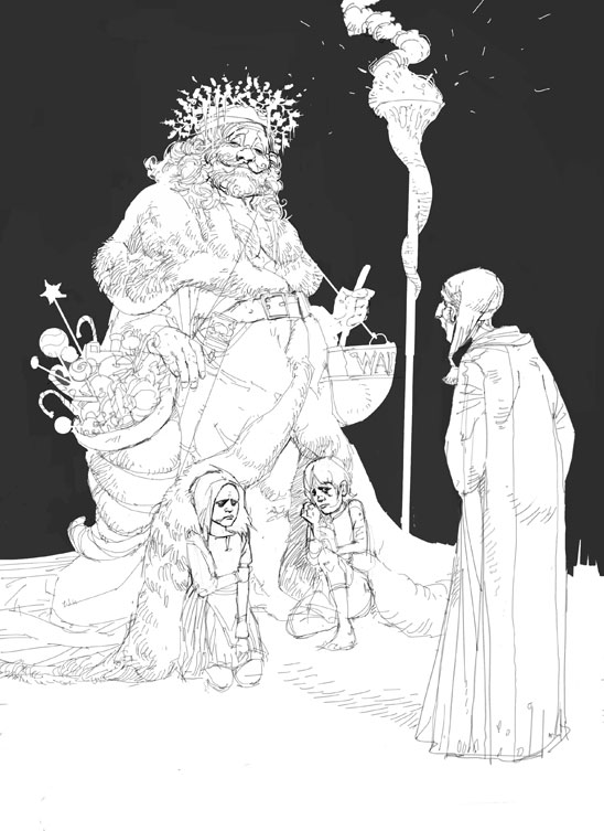 First sketch of Ghost of Christmas Present. Line style with background black dropped in with paint bucket and worked over with various grey shades for texture.
