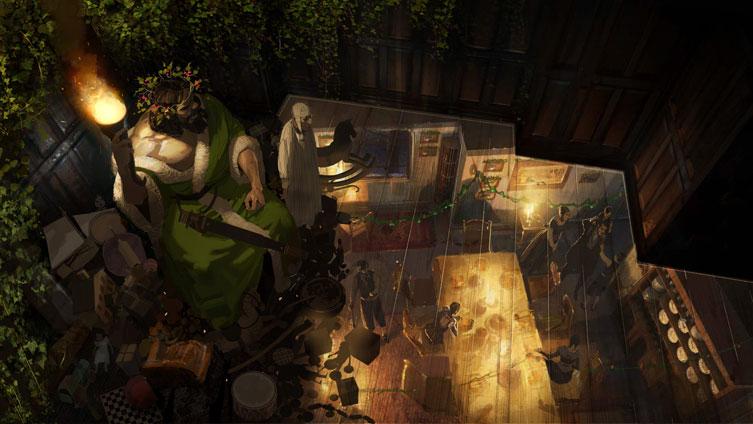 View from Ghost of Christmas Present's hovering room. Started out as quick figure drawings for another artists illustration. Interesting challenge to do figures from above.