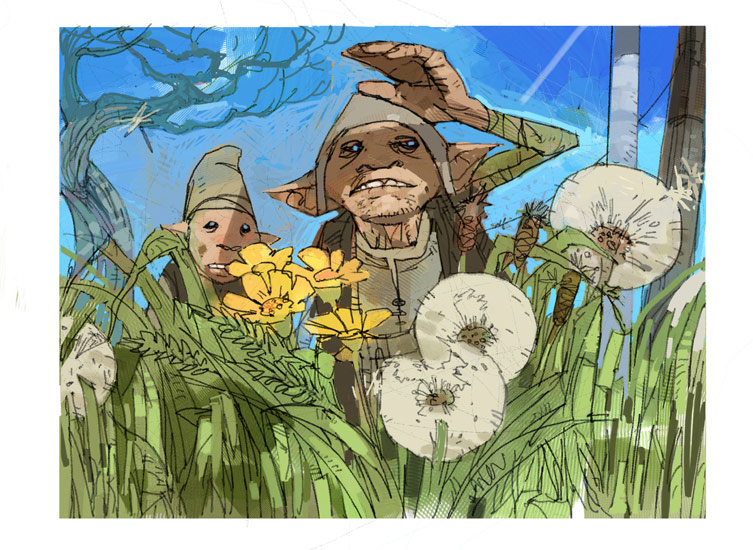 Garden gnomes didn't make it to the film- i liked the idea of them pushing through an ordinary garden...even more ordinary for the jet trail in sky