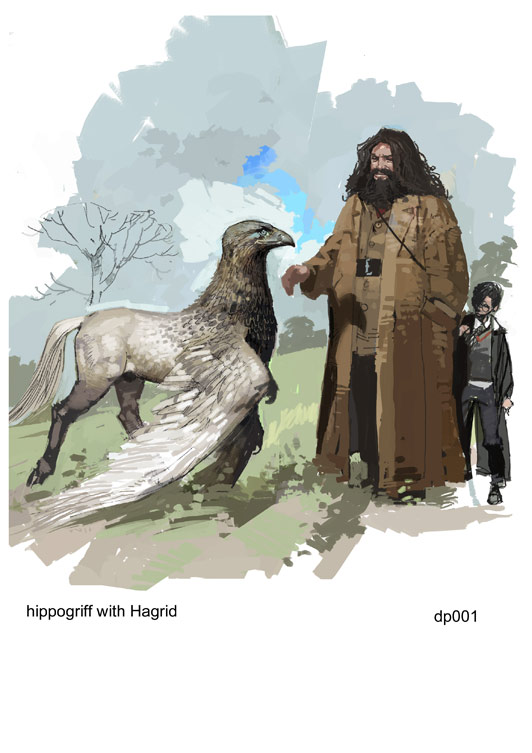 Very first Buckbeak sketch. still considered a four limbed creature at this stage...looks tiny next to Hagrid; should have had Harry on his own