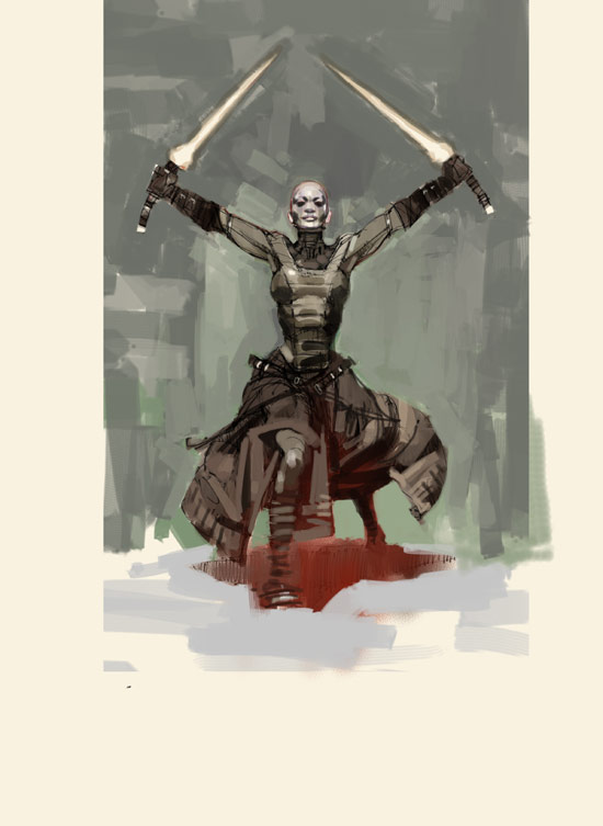 Sith with two light sabres. At this point we didn't know if the Sith was male, female, human or alien. I I wanted to suggest that she had a unique graceful form of fighting.