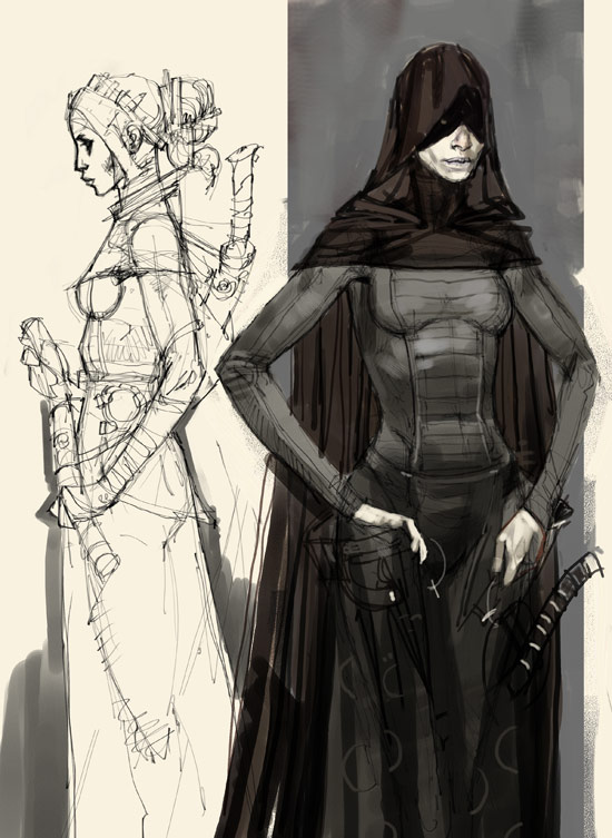 More Sith sketches. I messed the head up but needed to hit a 4pm deadline so gave her a hood. Kinda works. All done with painter on warm toned paper. Went through a stage of colouring the paper to make it look richer or older or something.